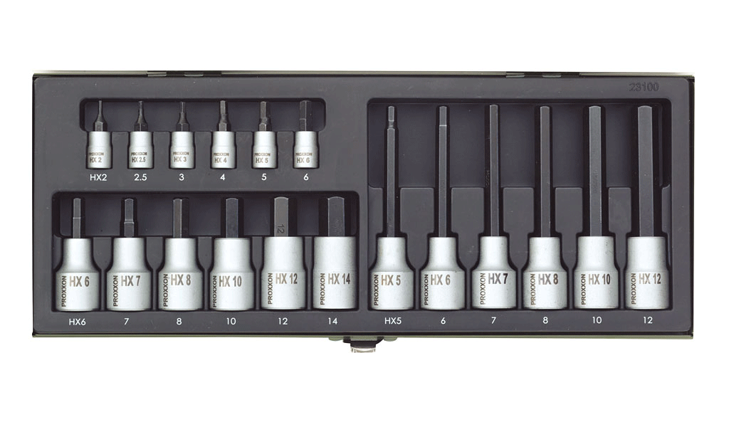 Jeu de douilles de 6 – 24 mm. Douilles rallongées pour boulons filetés dépassant largement de 10 - 13 - 15 et 17 mm. Douilles spéciales bougies 14 - 16 - 18 et 19 mm. Embouts de vissage 4 pans pour vis HX, TX et XZN. 8 clés coudées HX 1,25 - 1,5 - 2 - 2,25 et 3 mm ainsi qu'en T X6 - 8 et 10. Composition selon illustration.
