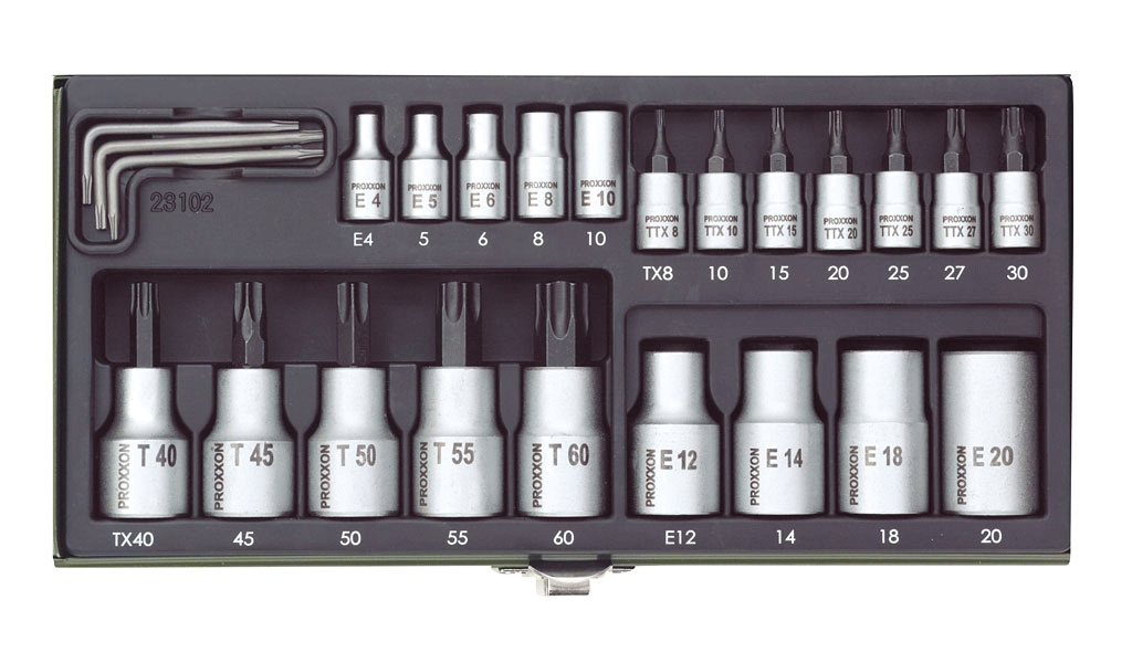 Embouts de vissage TX à entraînement 1/4" (6,3 mm) de TX 8 à TX 30 (troué) et douilles TX de E4 à E10 (toutes avec un couple de serrage jusqu'à 25 Nm). Avec entraînement 1/2" (12,5 mm) de TX 40 à 60 et douilles TX E12 à E20 (pour un couple de serrage de 25 à 135 Nm). 3 clés coudées TX 6, 8 et 10. Composition selon illustration.